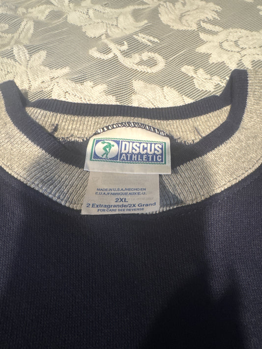 (2XL) Vintage Discuss Athletic Navy Blue With Grey Accents Sweater.