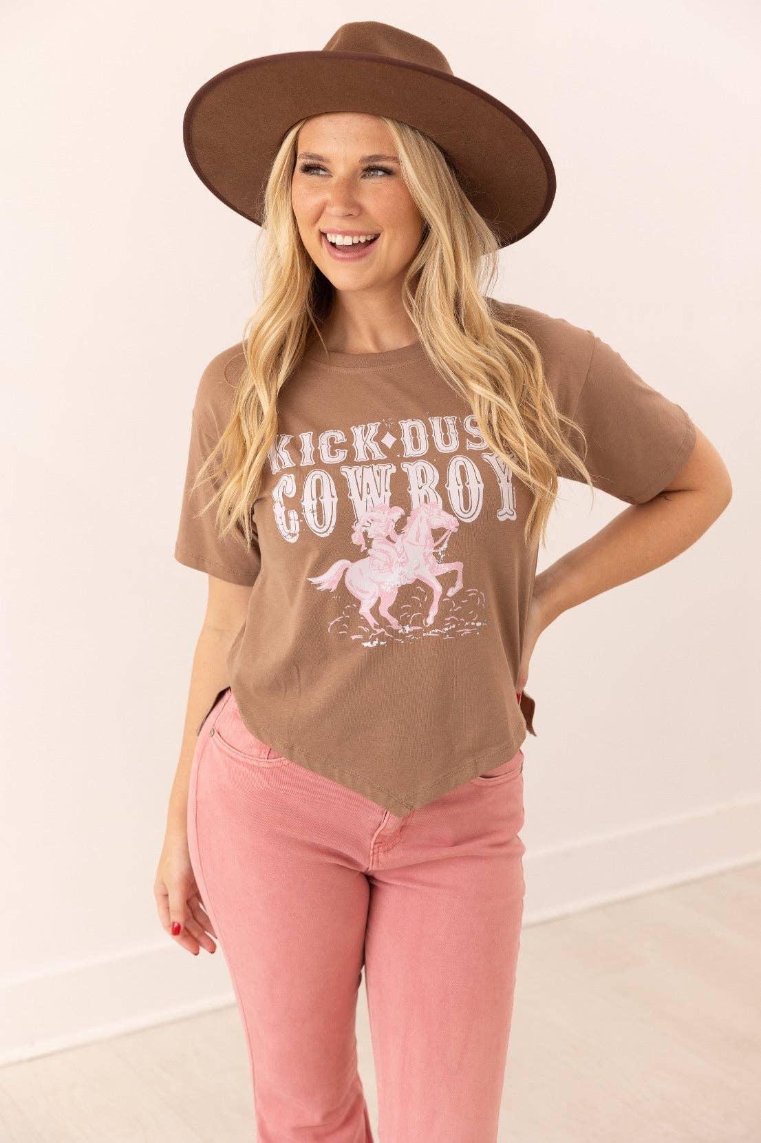 Designed for style and comfort, this tee features a mom crop length with a trendy V-hem that adds a unique touch. The high-stretch fabric provides a flexible, flattering fit, while the classic crew neckline keeps it effortlessly versatile. Lightweight and unlined, it's perfect for pairing with your favorite high-waisted pieces. Proudly printed in Texas, this tee brings cowboy charm to your everyday look.