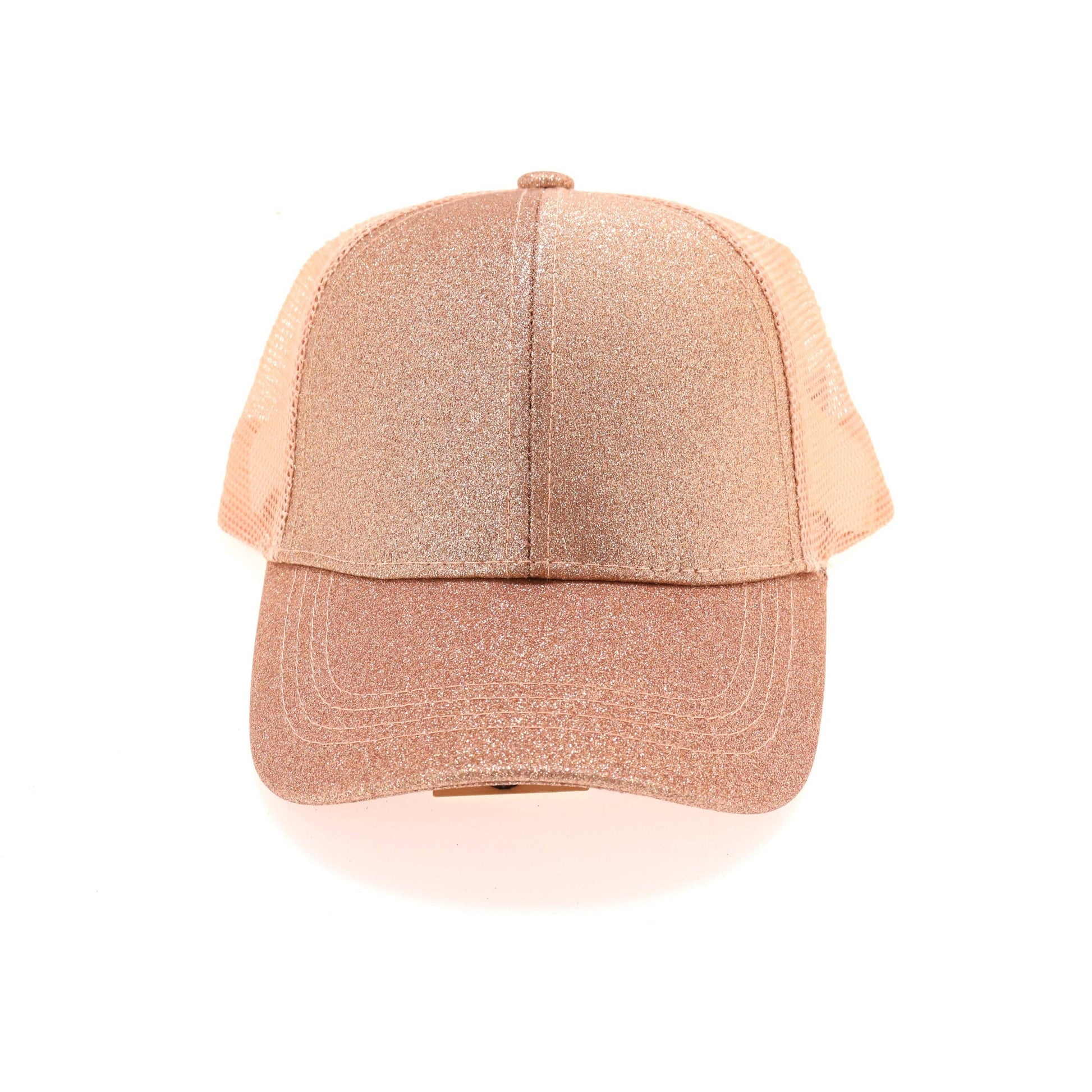 This cap features a rounded bill, a glitter front, a mesh back with a glitter Velcro adjustable back strap, and top opening for your high ponytail or messy bun.