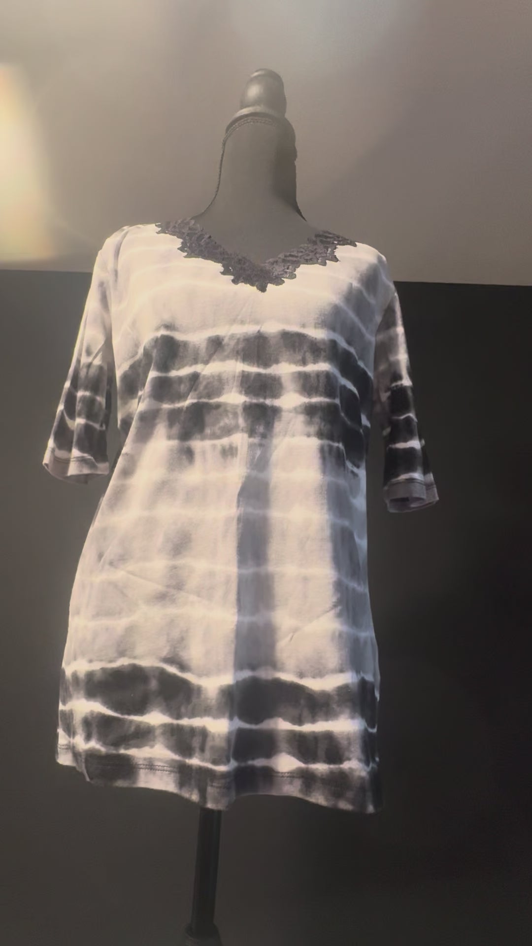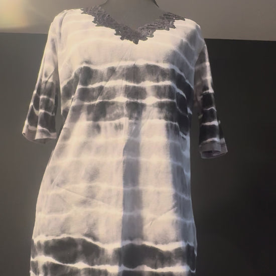 Elegant yet easygoing — this Vintage Jones New York Signature blouse blends a soft cotton feel with a striking black and gray abstract pattern. Finished with lace detailing at the neckline, it offers just the right mix of comfort and sophistication. Perfect for work, weekends, or styled up for an evening out.