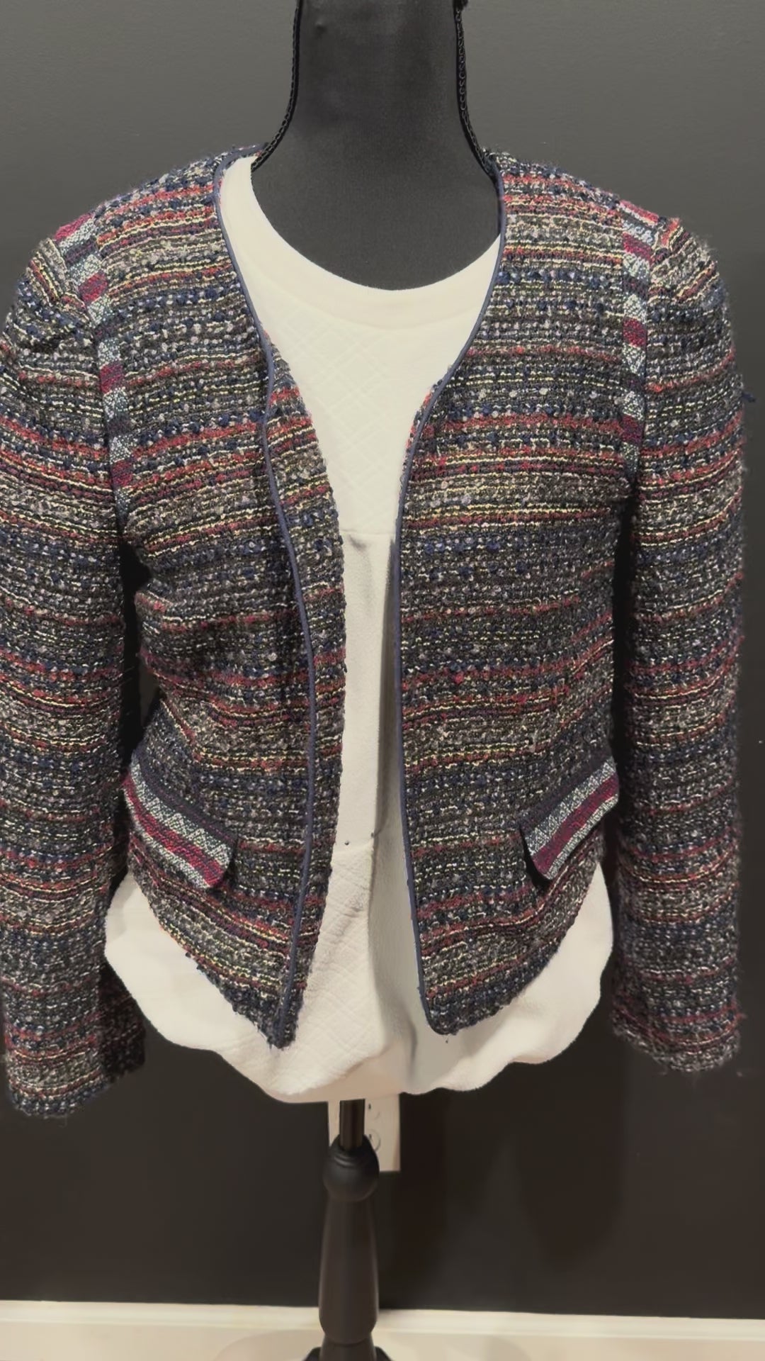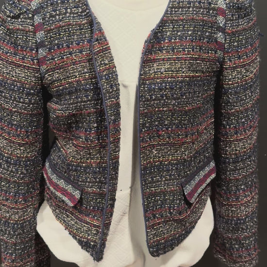 (MEDIUM) Y2K Ann Taylor Loft Navy Blue Striped Tweed Open Crop Blazer Jacket Size 8